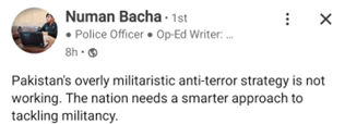 Not everyone in institutions like the military or police agrees with the government’s use of force to maintain order. For example, Numan Bacha, a police officer with a criminology degree, believes force should not be sued. He believes Pakistan’s resilience in military solutions to fight terrorism is not working. He suggests a smarter approach to deal with militancy.