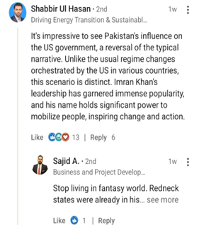 Shabir Ul Hassan’s comment talks about what he sees as a big change in the usual relationship between Pakistan and the United States. He feels proud that Pakistan now seems to have some influence on U.S. politics, which he describes as the opposite of what usually happens. In the past, people often saw the U.S. as interfering in other countries’ politics, including Pakistan. However, Hassan believes this situation is different and gives credit to Imran Khan’s leadership for this shift.