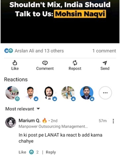 Mohsin Naqvi’s post stated that sports and politics should not mix and that India should engage in talk with Pakistan, referring to India’s refusal to play cricket in Pakistan. In response, a girl named Mariam humorously commented, suggesting that an option of “curse” should be added to his post. Her sarcastic response shows how frustrated some people are with political discussions between India and Pakistan. Her comment points out that people might not take these discussions seriously anymore. They feel like nothing is changeable, despite the call for peace. Moreover, it is important to note that when